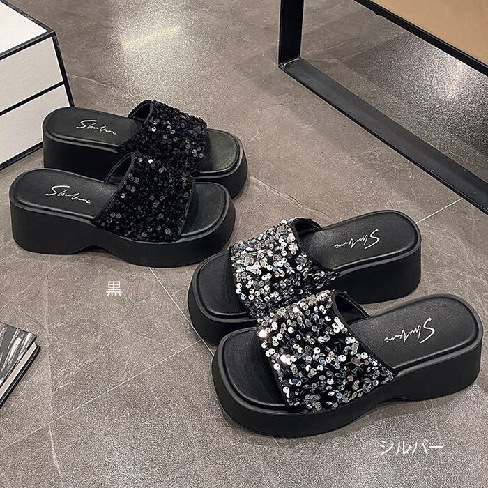 レディース ミュール オープントゥ スタイルアップ スパンコール 厚底 歩きやすい キラキラ